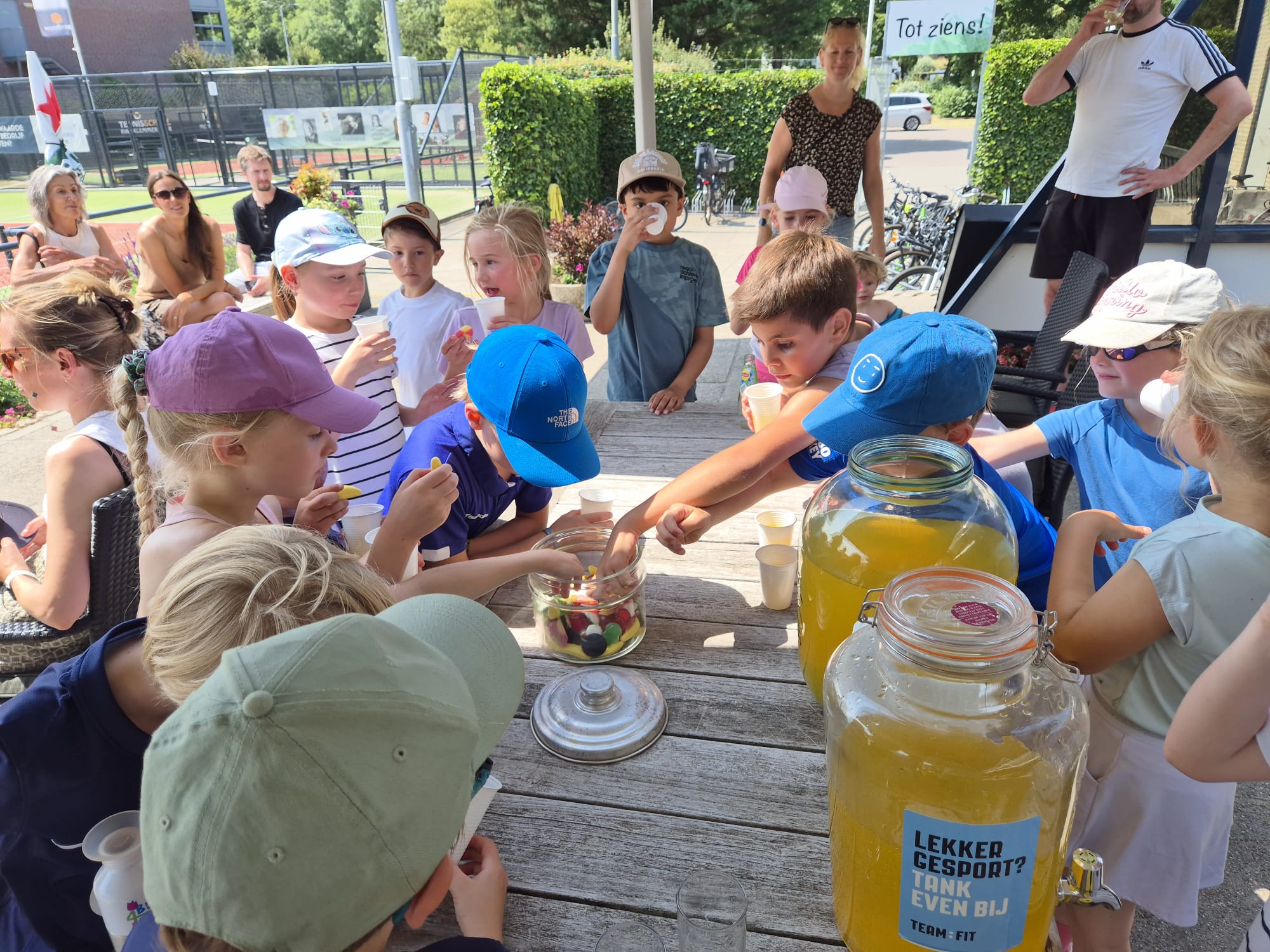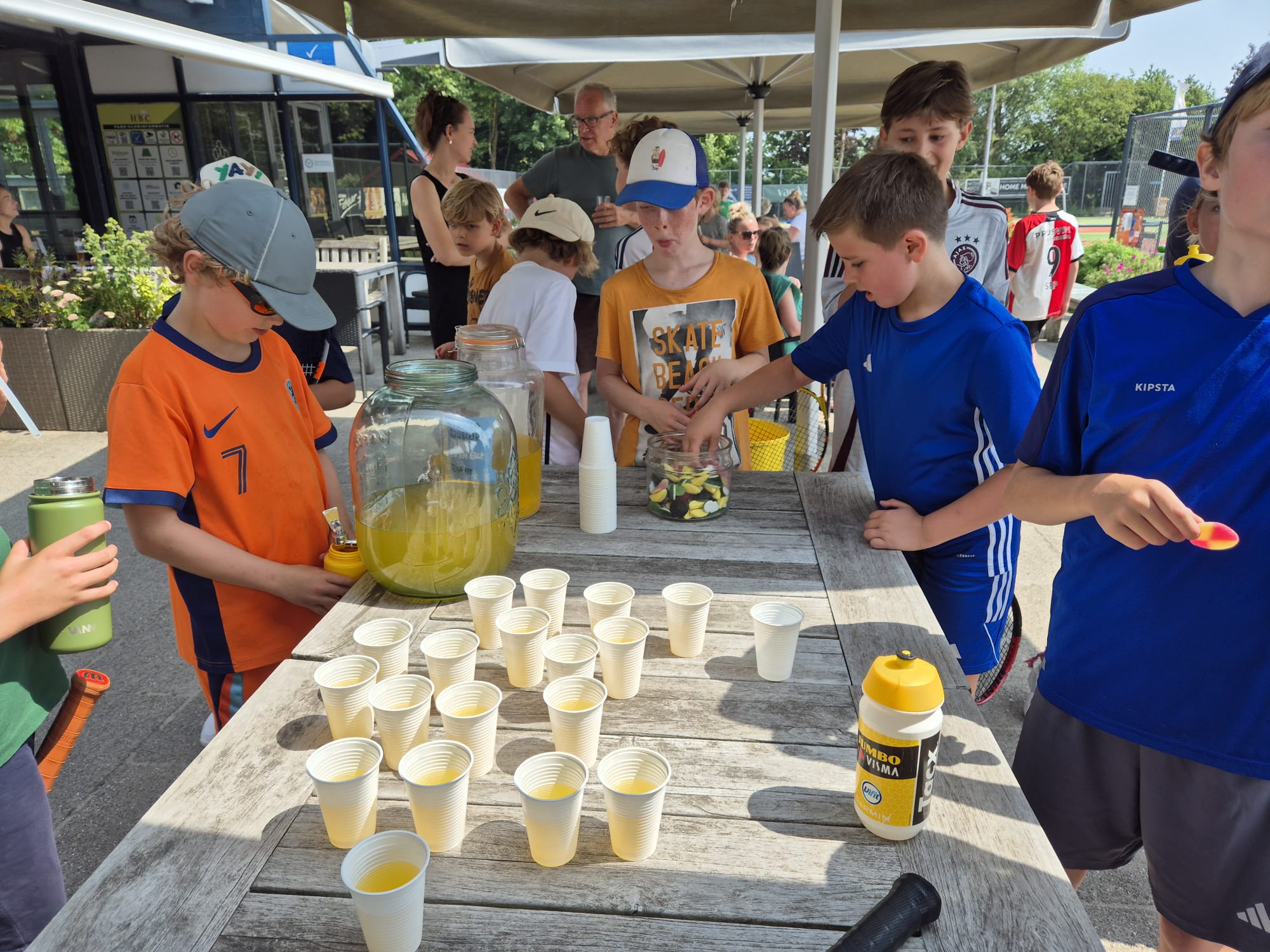 Met veel drinken tussen de wedstrijdjes door was het goed te doen voor de jeugd.