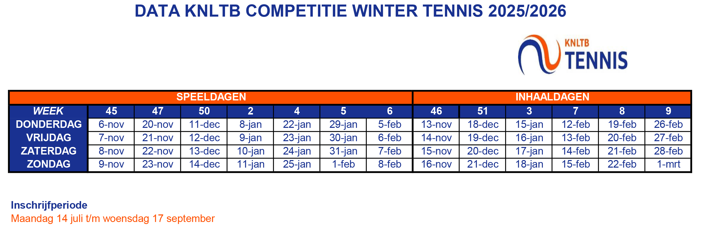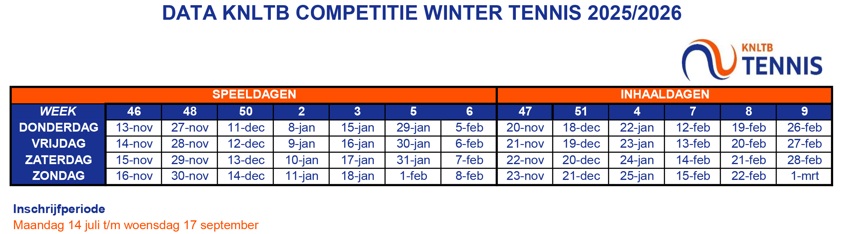 KNLTB Wintercompetitie 2025-2026, alle teams en reserves.