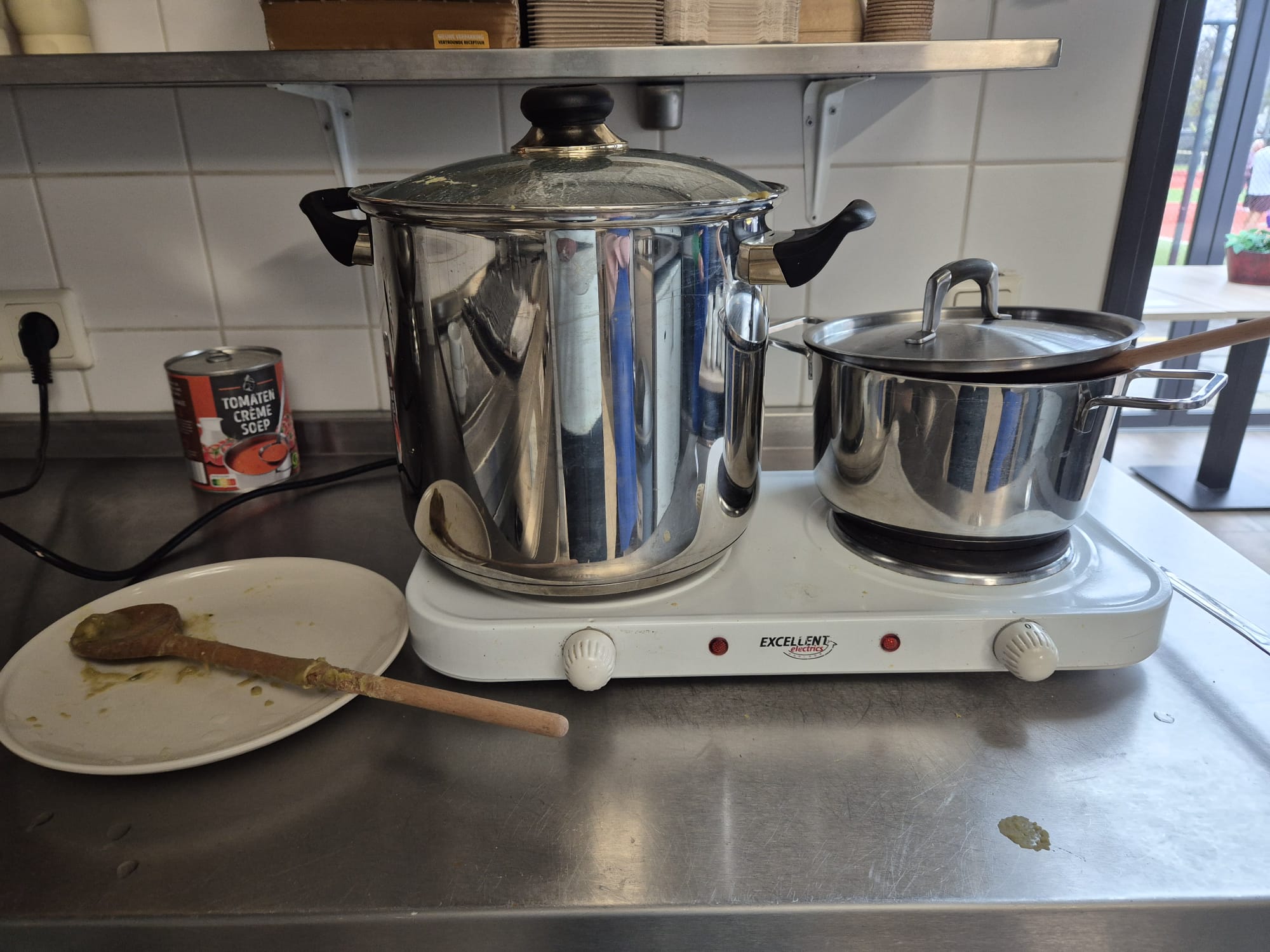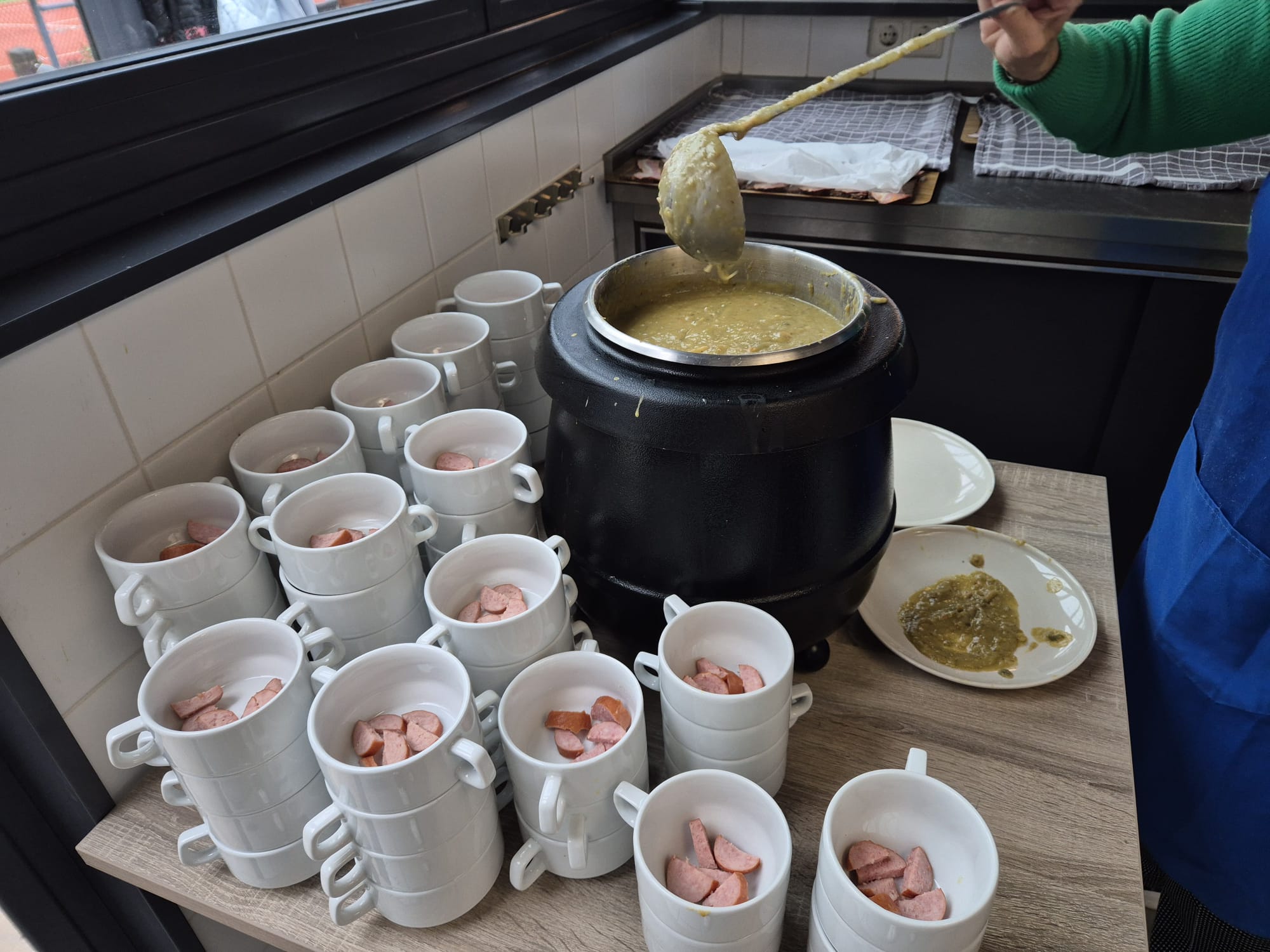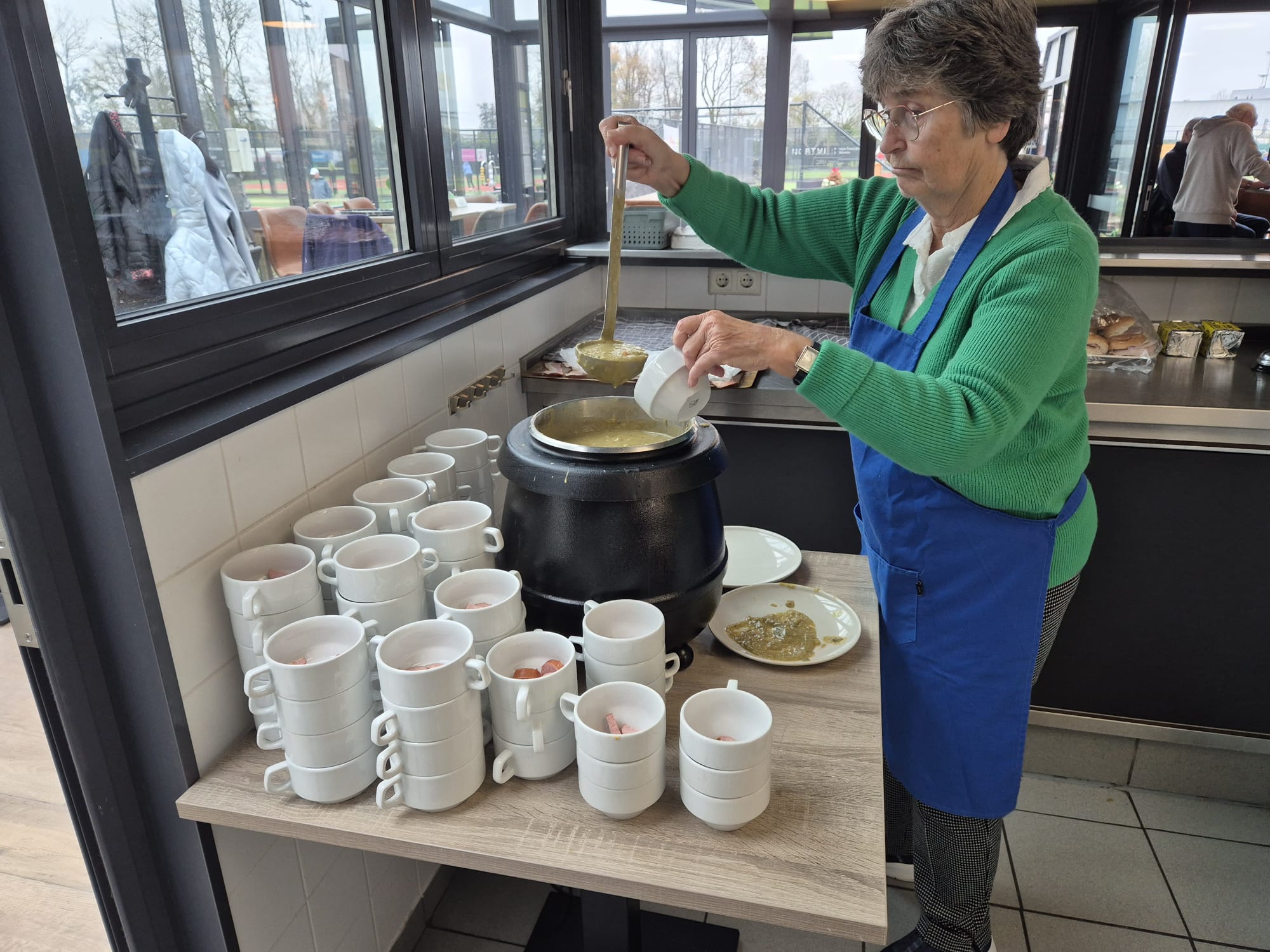 Ondertussen werd er in de keuken hard gewerkt door Marja en Leny. Dankzij hun inzet stonden de dampende snert en het roggebrood met spek precies op tijd klaar na de tweede ronde. Een warm hoogtepunt op een natte dag!