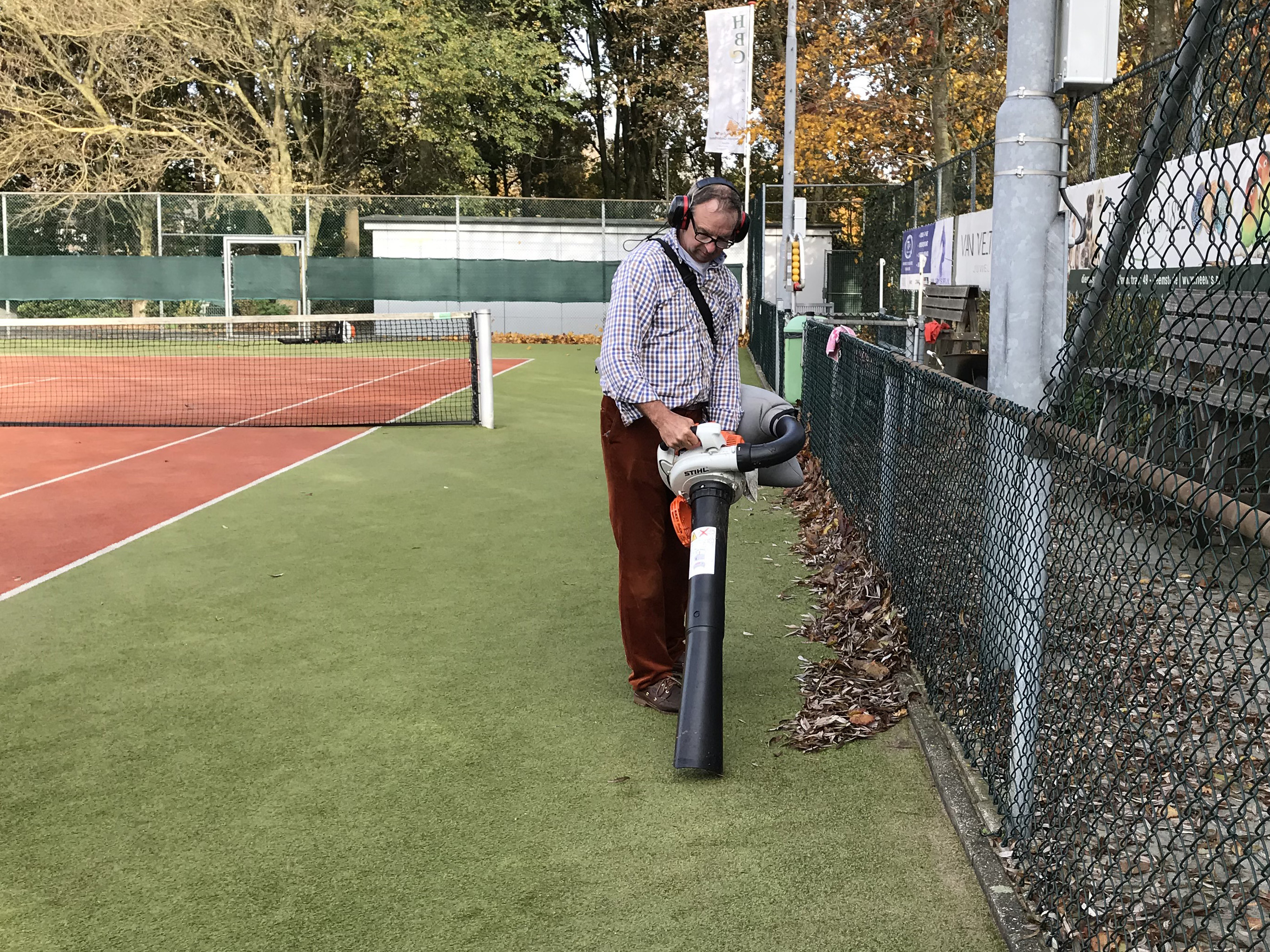 Zeker 3x per week maakt Ton onze tennisbanen bladvrij. Hij kijkt uit naar het vertrek van de herfst.