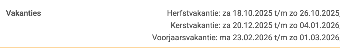 Er worden 17 lessen gegeven vanaf 06.10.2025 t/m 27.03.2026, elke week behlve tijdens de vakanties. De laatste 3 weken zijn gereserveerd voor maximaal 3 inhaallessen. Meer details staan op de site van Tennisschool Haarlemmermeer.